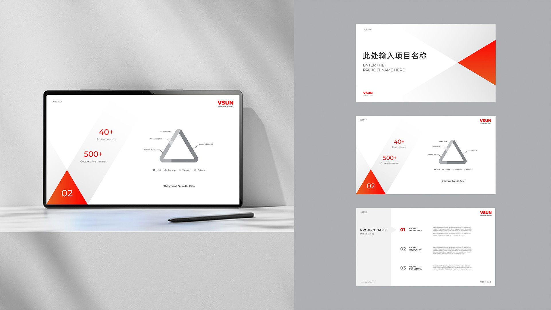 在項(xiàng)目初期,煥識(shí)團(tuán)隊(duì)與VSUN內(nèi)部團(tuán)隊(duì)進(jìn)行了多輪探討,在品牌對(duì)外表達(dá)的語詞上進(jìn)行了明確的定義,共同提出“以光賦能,共創(chuàng)未來”的基本視覺理念。基于這一視覺理念呼應(yīng)了VSUN品牌在業(yè)務(wù)中為客戶定制解決方案、與客戶共同創(chuàng)造成就的精神。在該理念的指導(dǎo)下,我們針對(duì)原有字標(biāo)設(shè)計(jì)進(jìn)行了優(yōu)化,將原始字標(biāo)傾斜體角度擺正,增強(qiáng)了品牌視覺感官上的穩(wěn)定感與信賴感。在品牌色彩的選擇上,我們重新定義了“VSUN紅”,對(duì)紅色進(jìn)行色相的更新,使其紅色飽和度更高、更明亮,同時(shí)我們賦予了紅色漸變的使用,使視覺具備靈動(dòng)感。在品牌輔助圖形上,我們核心形塑了專屬于VSUN的品牌圖形系統(tǒng),以最穩(wěn)定,最簡潔的圖形”三角形“進(jìn)行演變衍生,從VSUN標(biāo)識(shí)中的字母V的結(jié)構(gòu)開始,以V的結(jié)構(gòu)中的交叉點(diǎn)為原點(diǎn),用相對(duì)的設(shè)計(jì)手法,形成雙三角形,代表著VSUN與客戶共同成就,共創(chuàng)未來的表達(dá),基于雙三角相對(duì)的圖形邏輯,根據(jù)不同的主題進(jìn)行圖形創(chuàng)造,形成豐富圖形語言,構(gòu)成獨(dú)特獨(dú)特的形象識(shí)別。全新的品牌視覺識(shí)別系統(tǒng)整體看起來更加和諧,一方面展現(xiàn)了VSUN穩(wěn)定踏實(shí)的優(yōu)良品質(zhì),另一方面,也是基于三角共聯(lián)的關(guān)系形成系統(tǒng)化圖形語言,塑造個(gè)性系統(tǒng),傳遞共創(chuàng)價(jià)值,為VSUN品牌注入更具現(xiàn)代化,更具科技感,更具時(shí)尚感的新鮮活力,賦予品牌從穩(wěn)定合作到共創(chuàng)未來的理念。