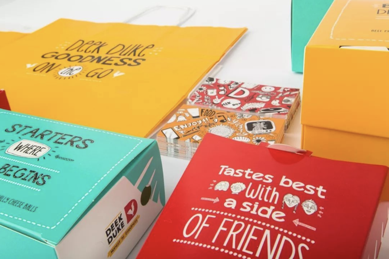 這是一家國(guó)外的炸雞快餐店外賣(mài)包裝設(shè)計(jì),其外賣(mài)包裝采用卡通風(fēng)格的插畫(huà)設(shè)計(jì),運(yùn)用鮮艷且豐富的色彩搭配,深受低年齡層消費(fèi)者的喜歡。